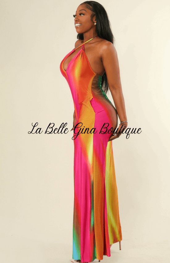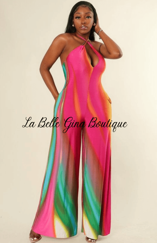 Avena Aurora Multi Print Cross Halter Neck Jumpsuit