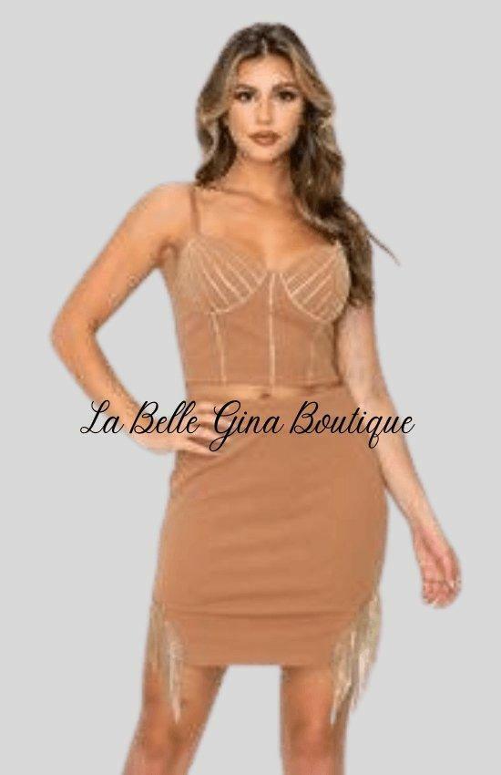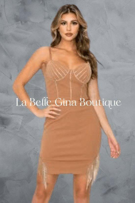 Belle Rhinestone Fringe Corset Mini Dress – Black & Nude