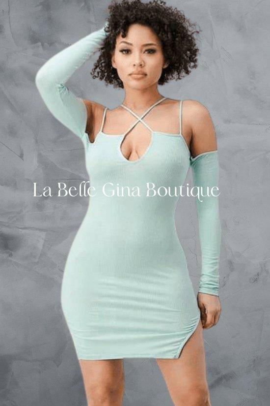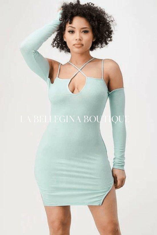 Avena One Shoulder Strap Chest Cut Out Side Slit Color Bodycon Midi Dress
