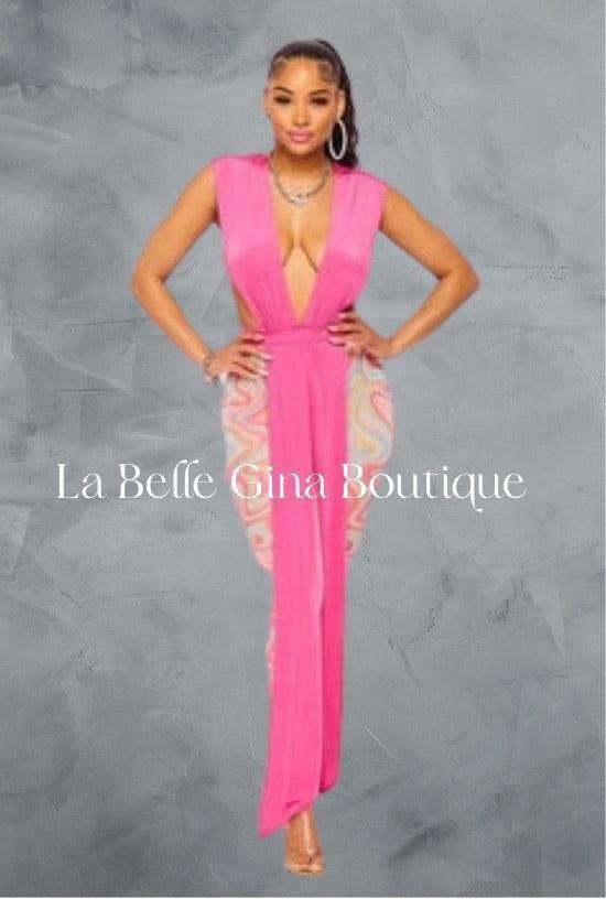 Athena Deep V-Neck printing strapping jumpsuit-Multicolor-FINALSALE