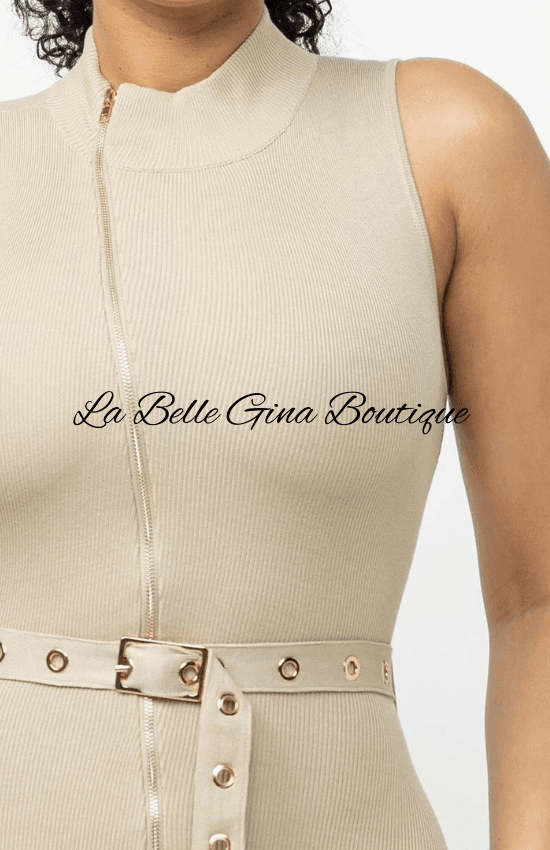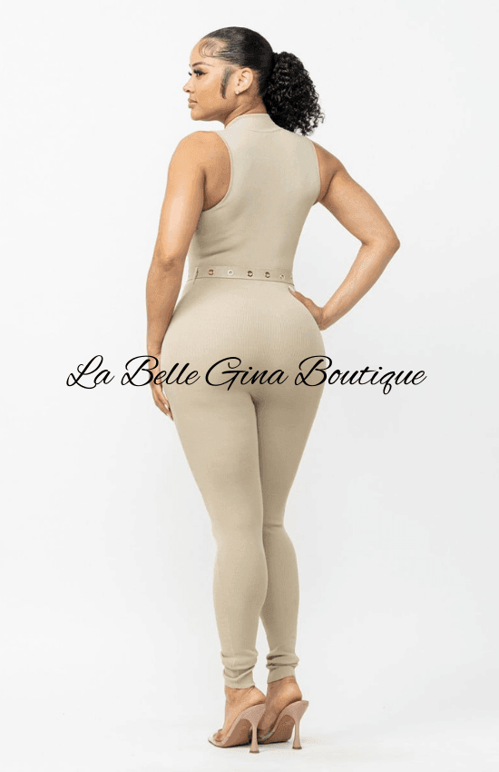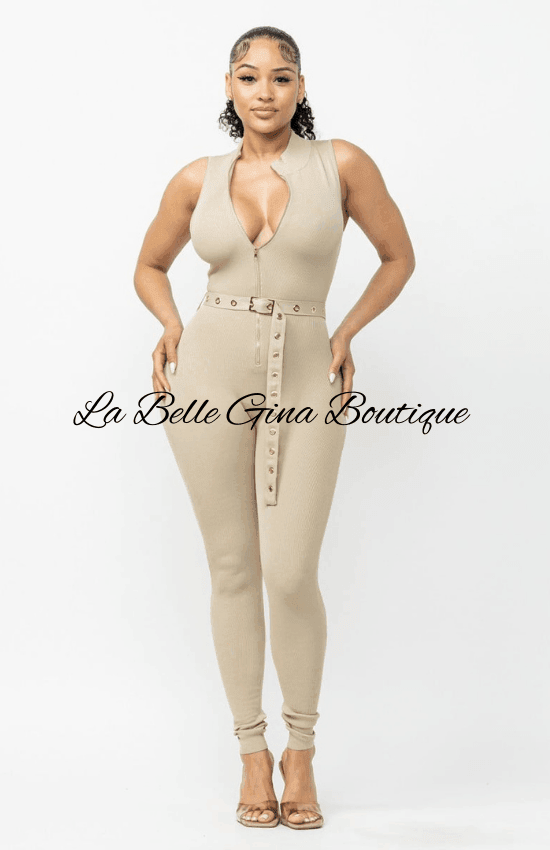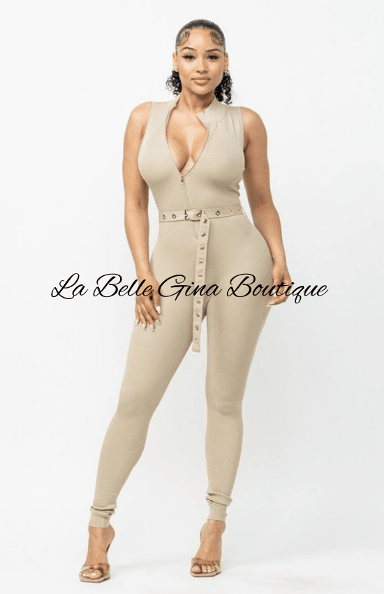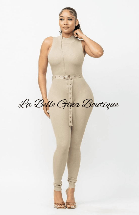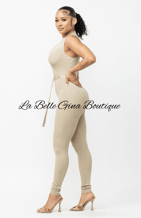 Kelly Sleeveless Front Zipper Mock Neck Top Belted Jumpsuit-Stone