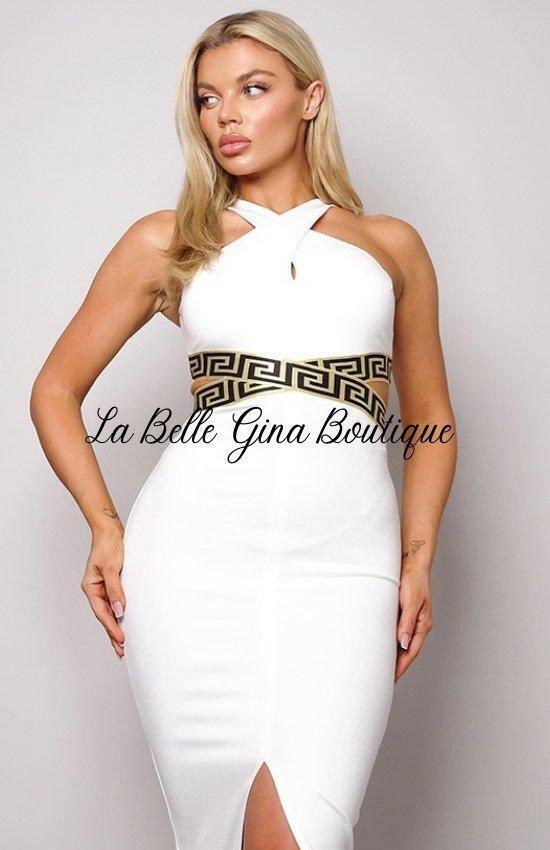 Camille Crossed Front Halter Geo Trim Mini Dress-Ivory - La Belle Gina Boutique