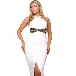 The halter neckline and crossed front design add a touch of elegance and sophistication to this dress, while the geo trim detailing adds a trendy and modern twist. The ivory color gives it a classic and timeless look that will never go out of style.