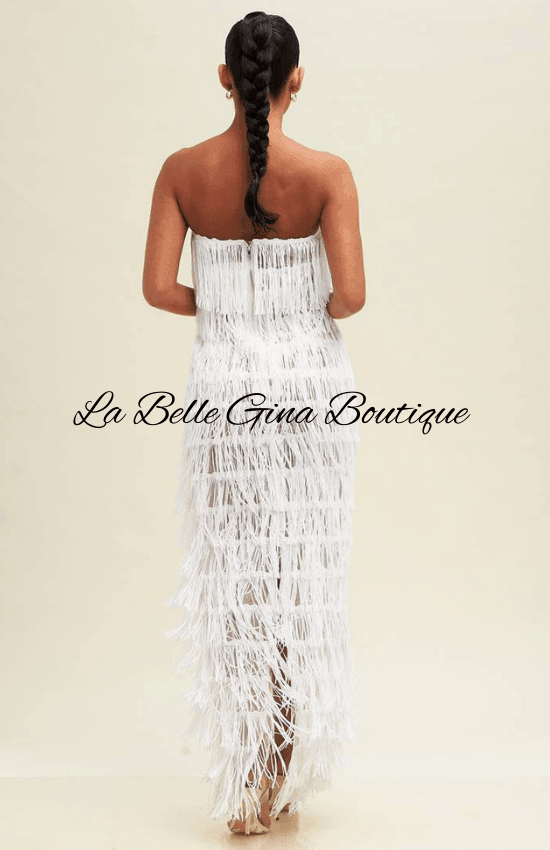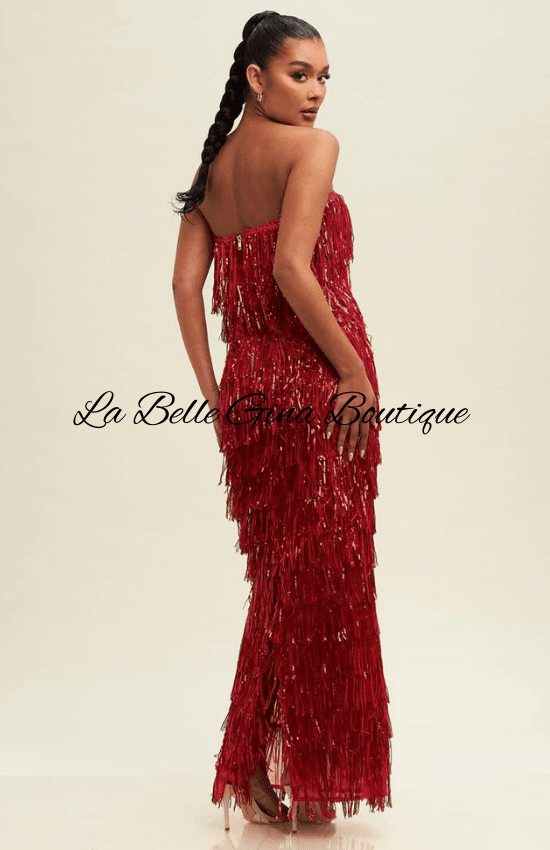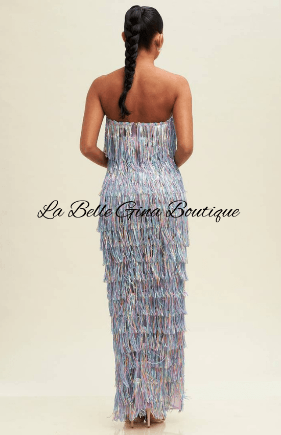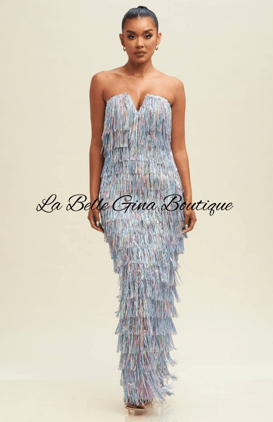 Step into the spotlight with the Gina Sequin Strapless V-Neck Fringe Maxi Dress in Lavender Multi. This stunning dress features a striking sequin design that sparkles at every angle, perfect for any glamorous occasion.