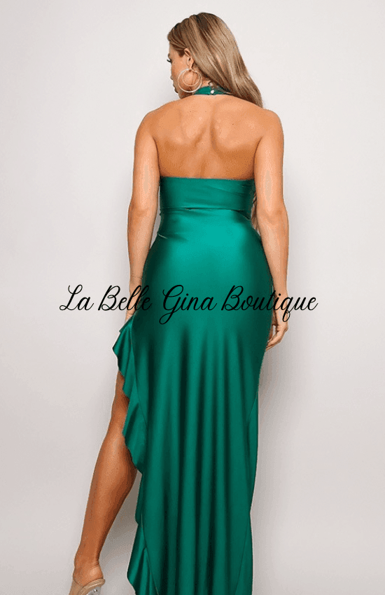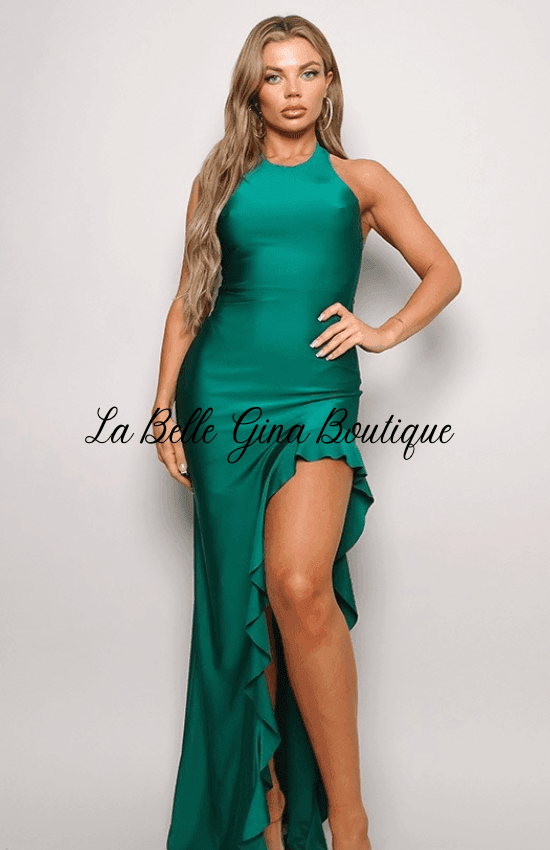 Laura Sleeveless Halter Neck Side Slit Ruffle Maxi Dress-Kelly Green