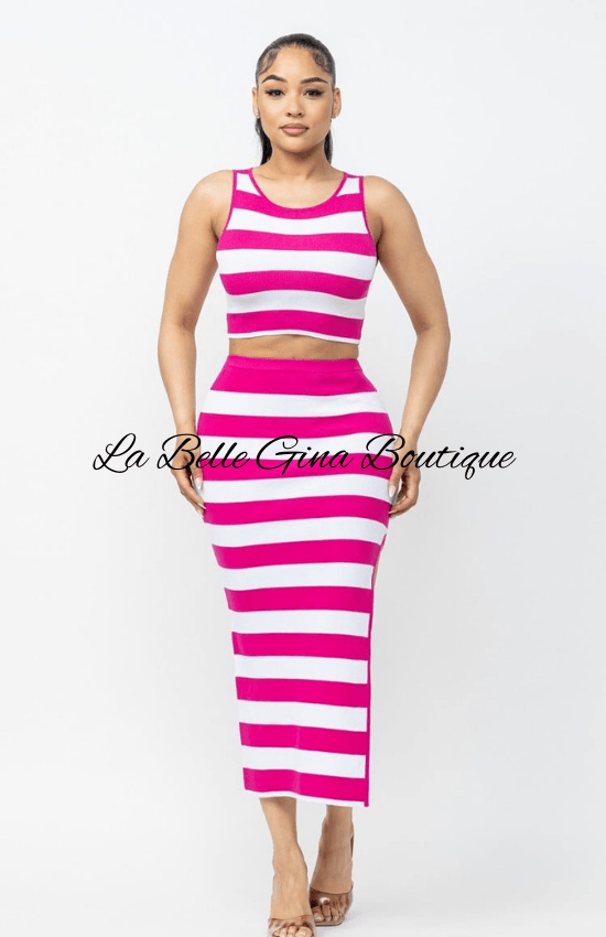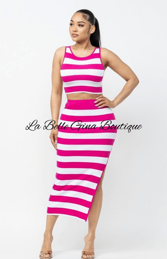 Sandra Sleeveless  Side Slit Maxi Skirt Set-White/Fuchsia
