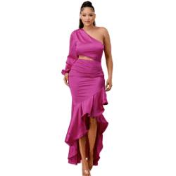 Featuring a unique one-shoulder design with a diagonal ruffle detail, this dress is guaranteed to turn heads wherever you go. The front cutout adds a touch of allure, while the ruffle details along the hemline provide a feminine and playful touch.