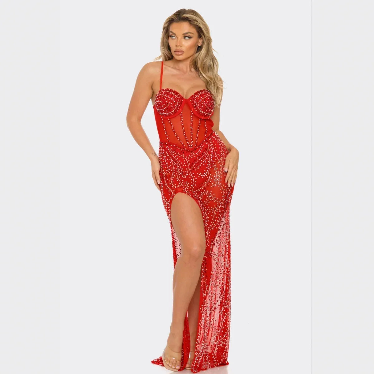 Shine all night in La Belle Gina Boutique’s Sheer Rhinestone Bustier Gown. Elegant maxi dress with high slit, rhinestone details & bustier bodice. Perfect for evening events.