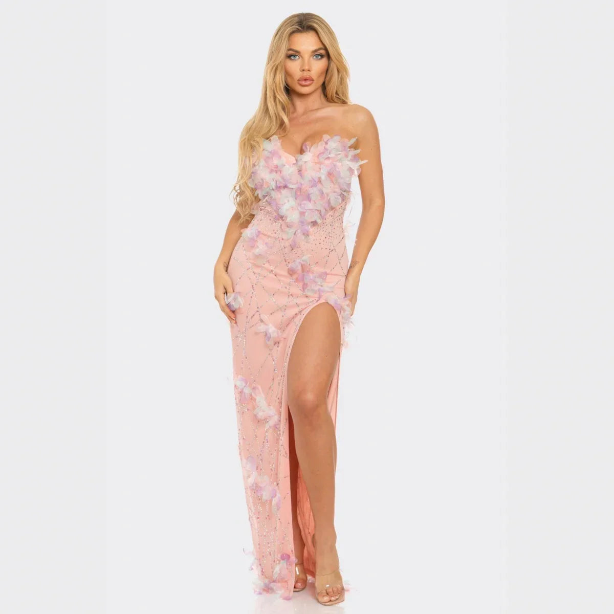 https://www.labelleginaboutique.com/collections/new-arrivals-fashionBring your fairytale moment to life in our strapless floral applique evening gown. This dreamy maxi dress features delicate 3D pastel flower appliques along the bust and cascading down the skirt, paired with sparkling rhinestone embellishments that shimmer beautifully under the light. The sweetheart neckline and thigh-high slit add a modern, sultry touch, while the flowing floor-length silhouette keeps it elegant and graceful.