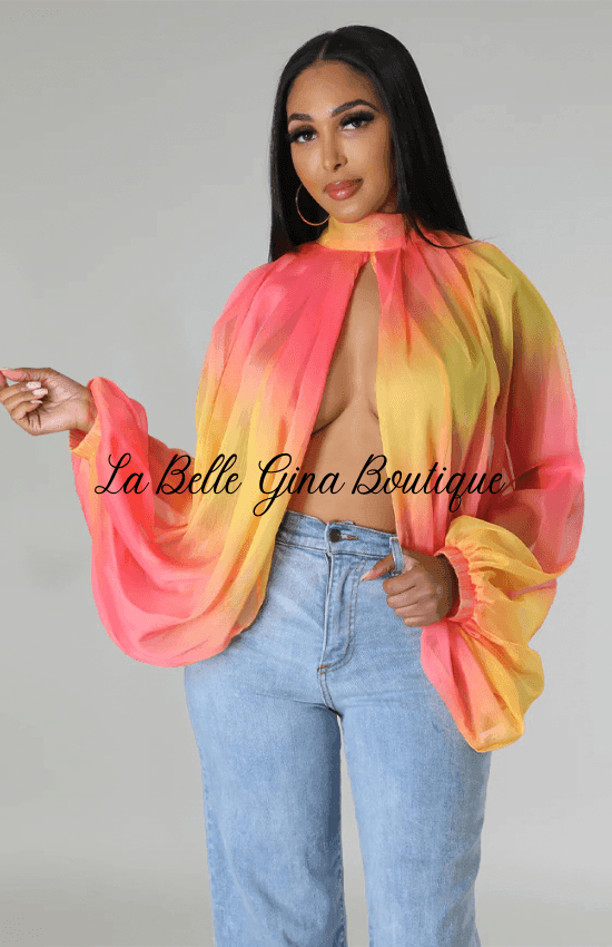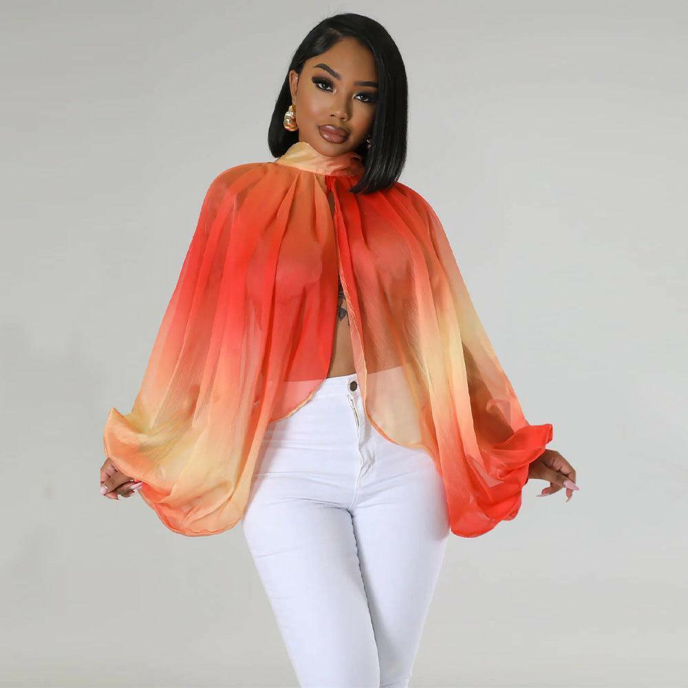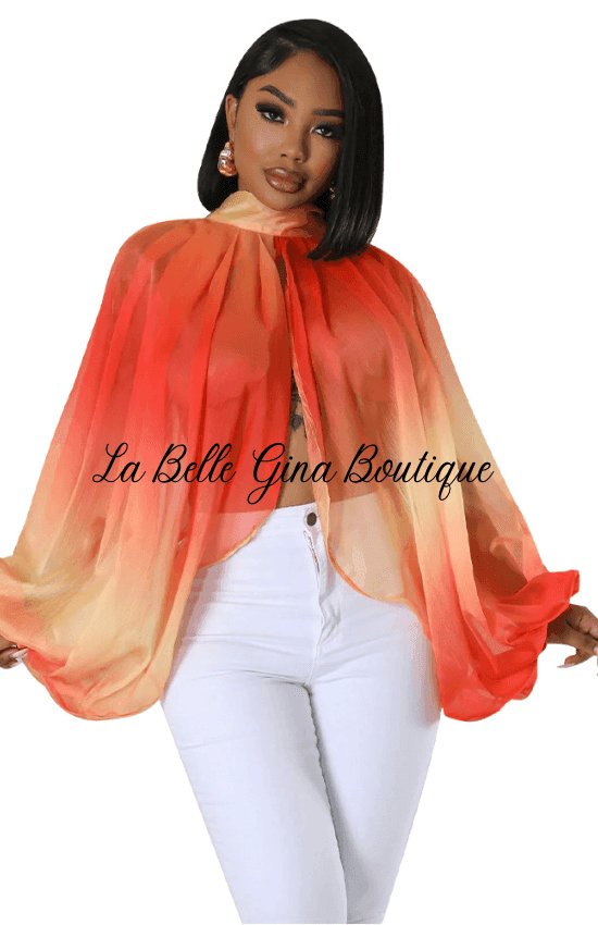 Lise Lace-up Printed Chiffon shirt Bat Sleeves Top-Orange - La Belle Gina Boutique