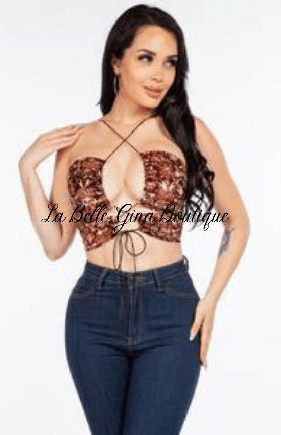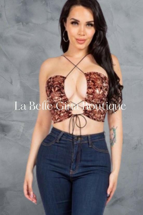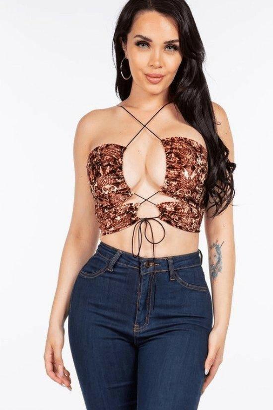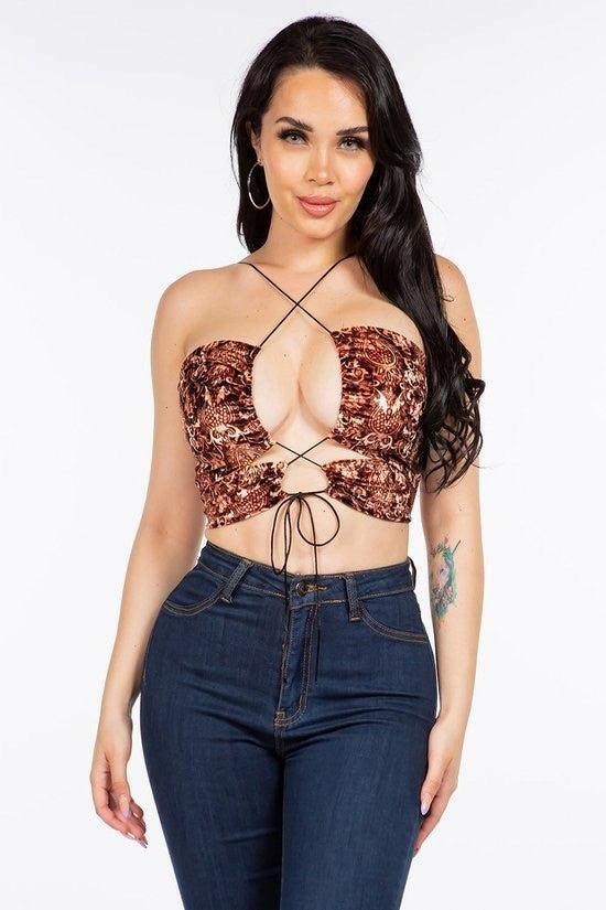 Sleeveless crisscross neck baroque printed velvet crop to- with cut out and tie straps.