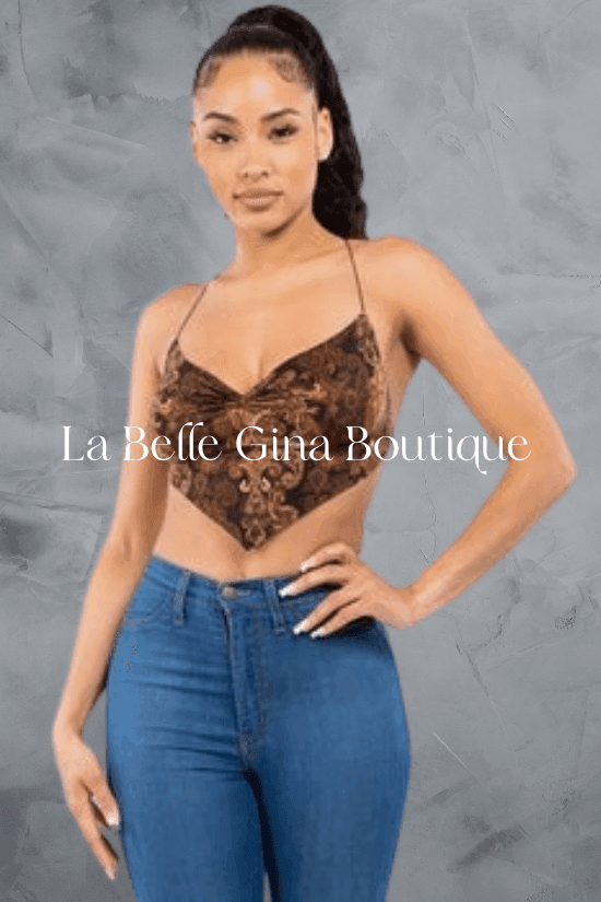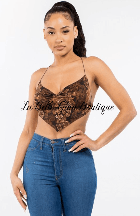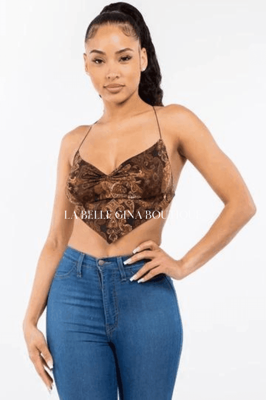 Kate sleeveless baroque printed crop top with crisscross open back. - La Belle Gina Boutique