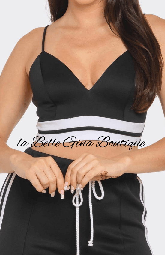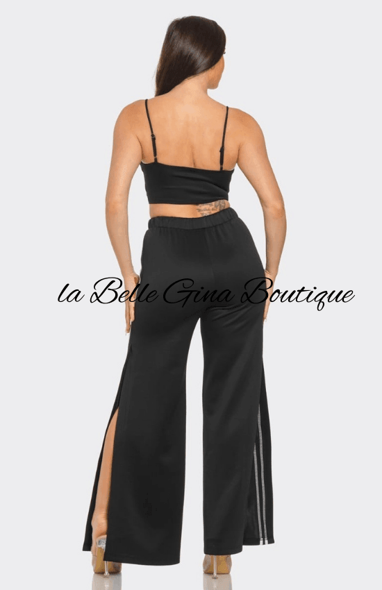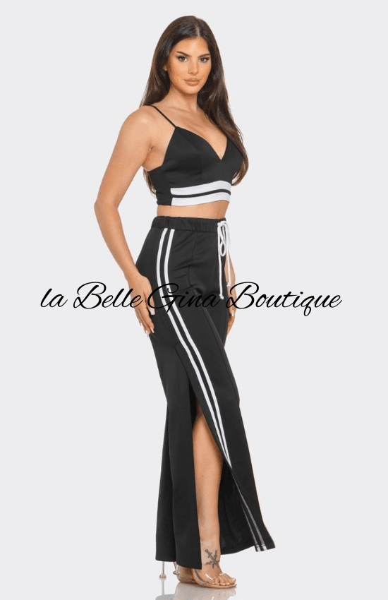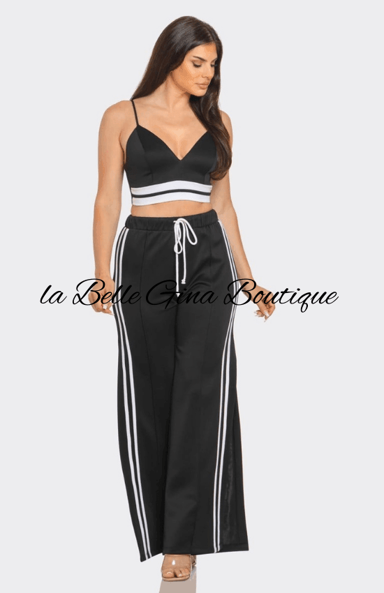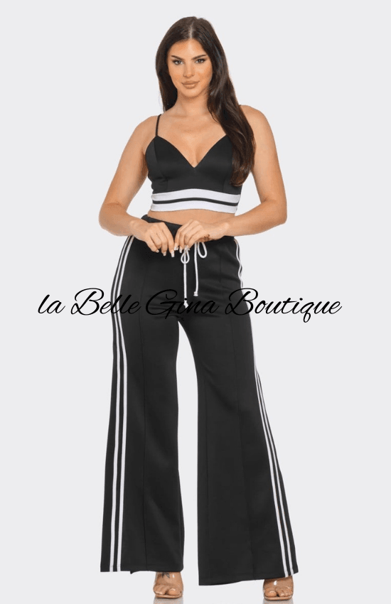 Alice Front bottom Striped Detail Adjustable Strap Bra Crop Top and Side Slit Two Stripes Flare Pants Set-Black/White
