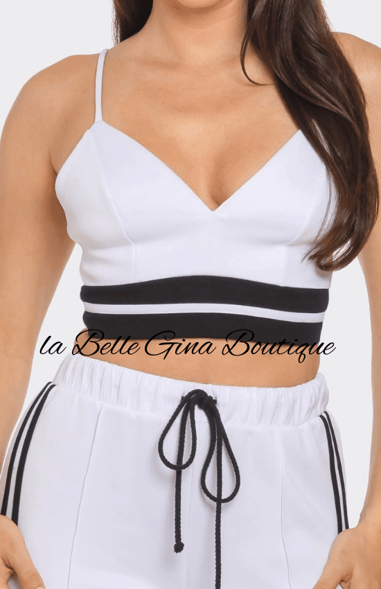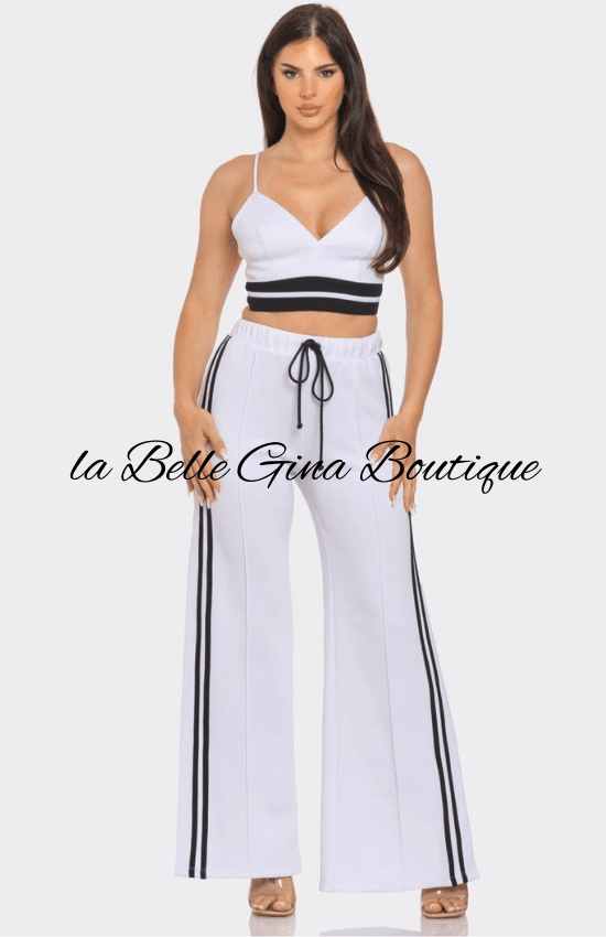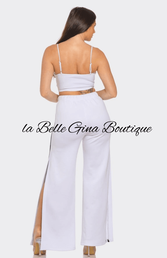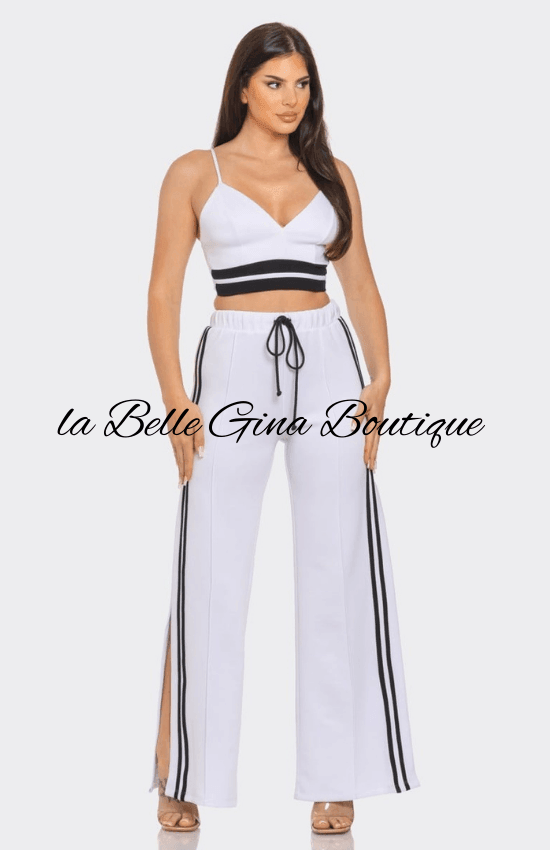Alice Front bottom Striped Detail Adjustable Strap Bra Crop Top and Side Slit Two Stripes Flare Pants Set-White