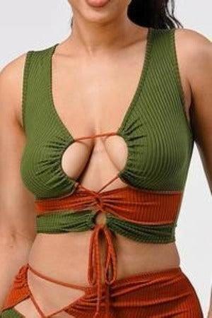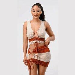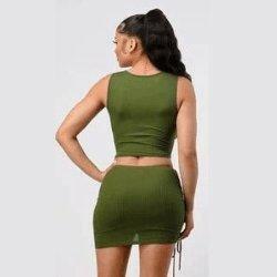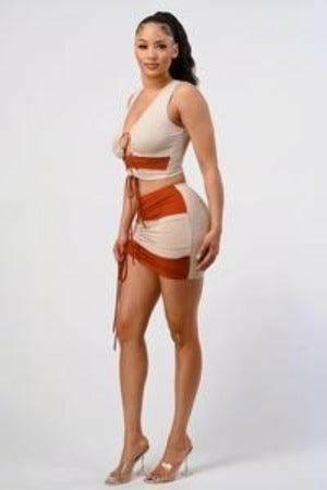 The crop top features an adjustable drawstring detail for a custom fit, paired with a coordinating mini skirt that completes the look. Both pieces are designed to hug your figure gently with stretchy, ultra-soft rib knit material. This fabric is breathable and lightweight, which makes it an ideal pick for hot days, energetic adventures, and warm evenings.