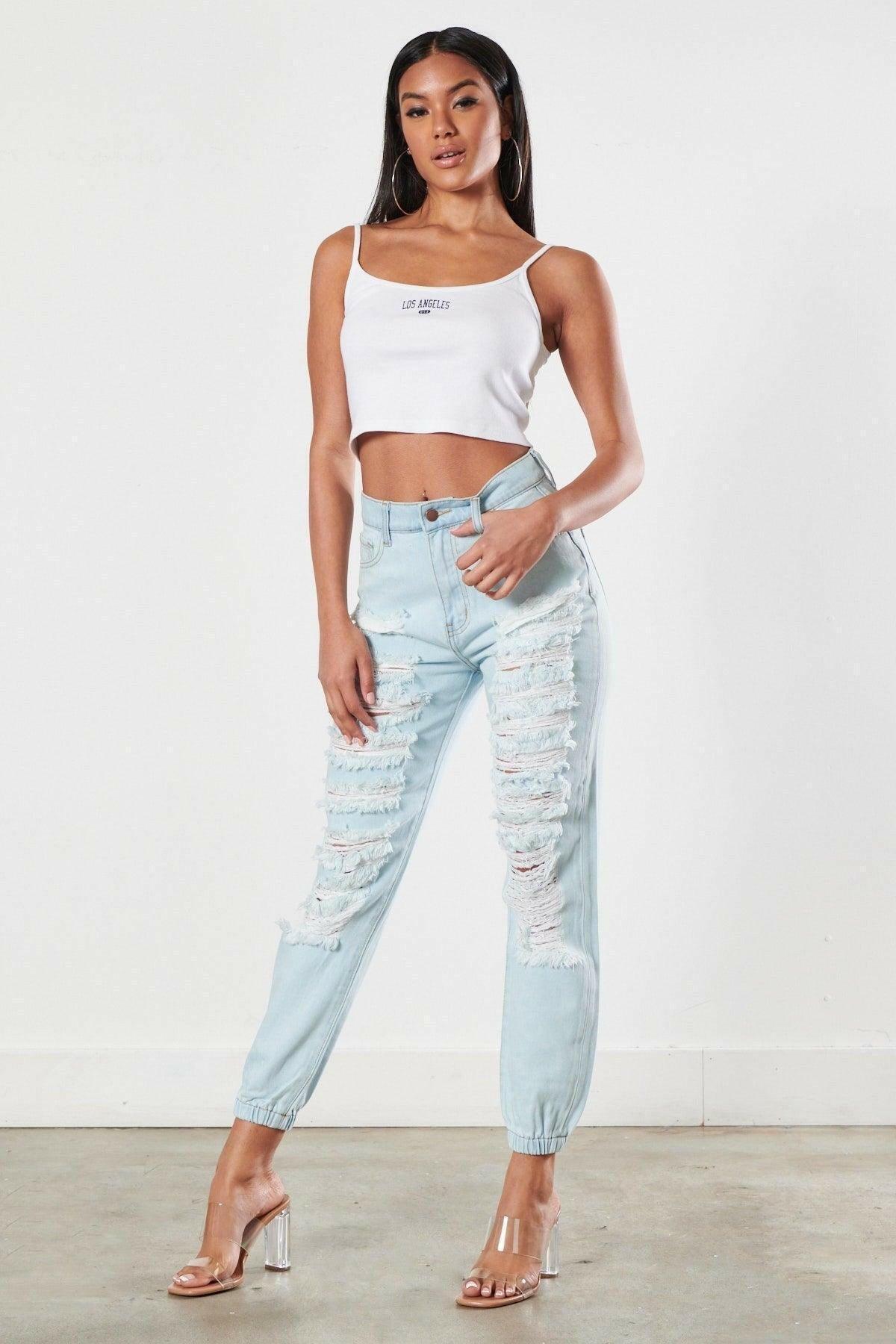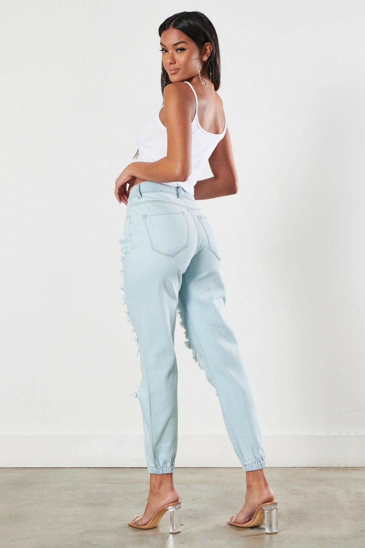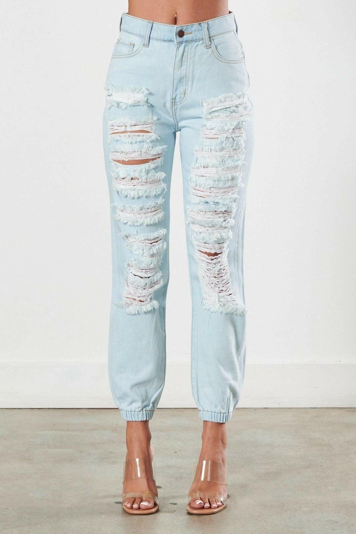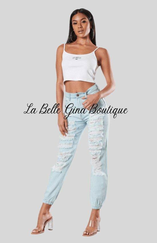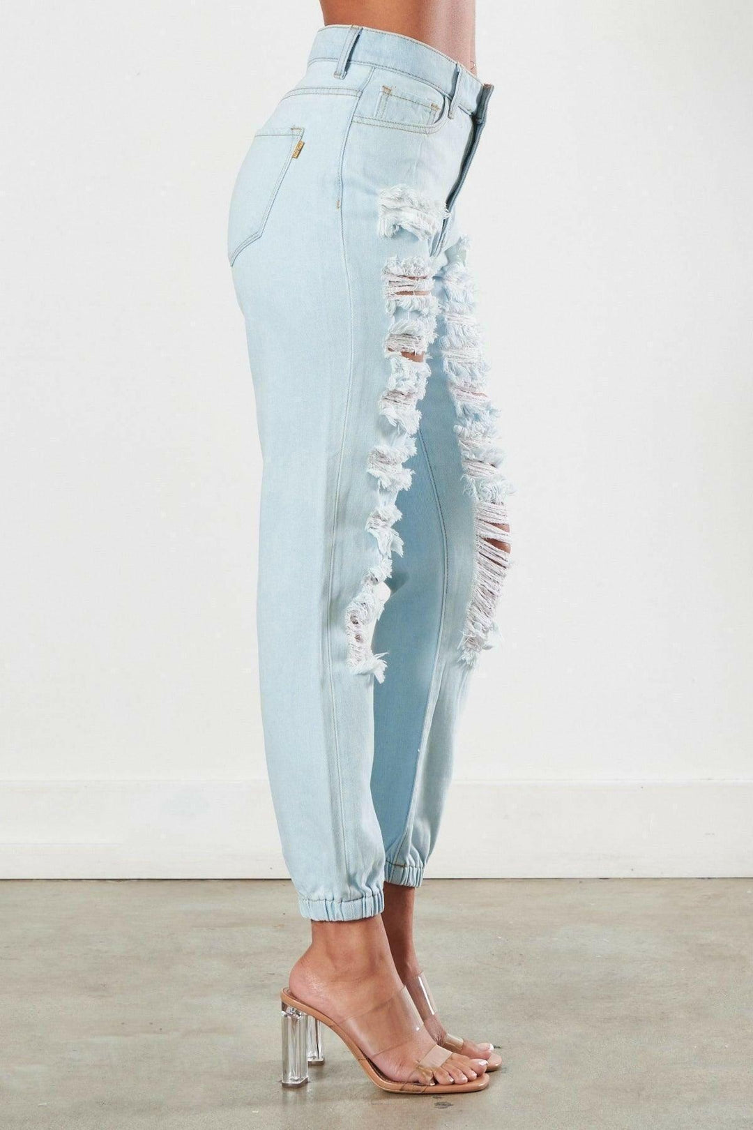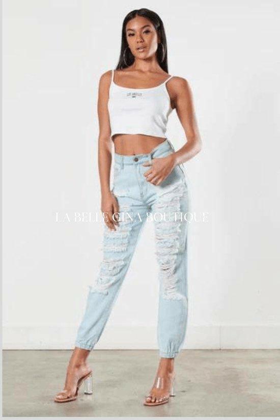 BENITA high waisted distressed mom with elastic waistband. - La Belle Gina Boutique