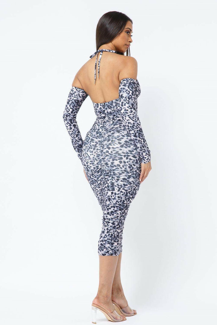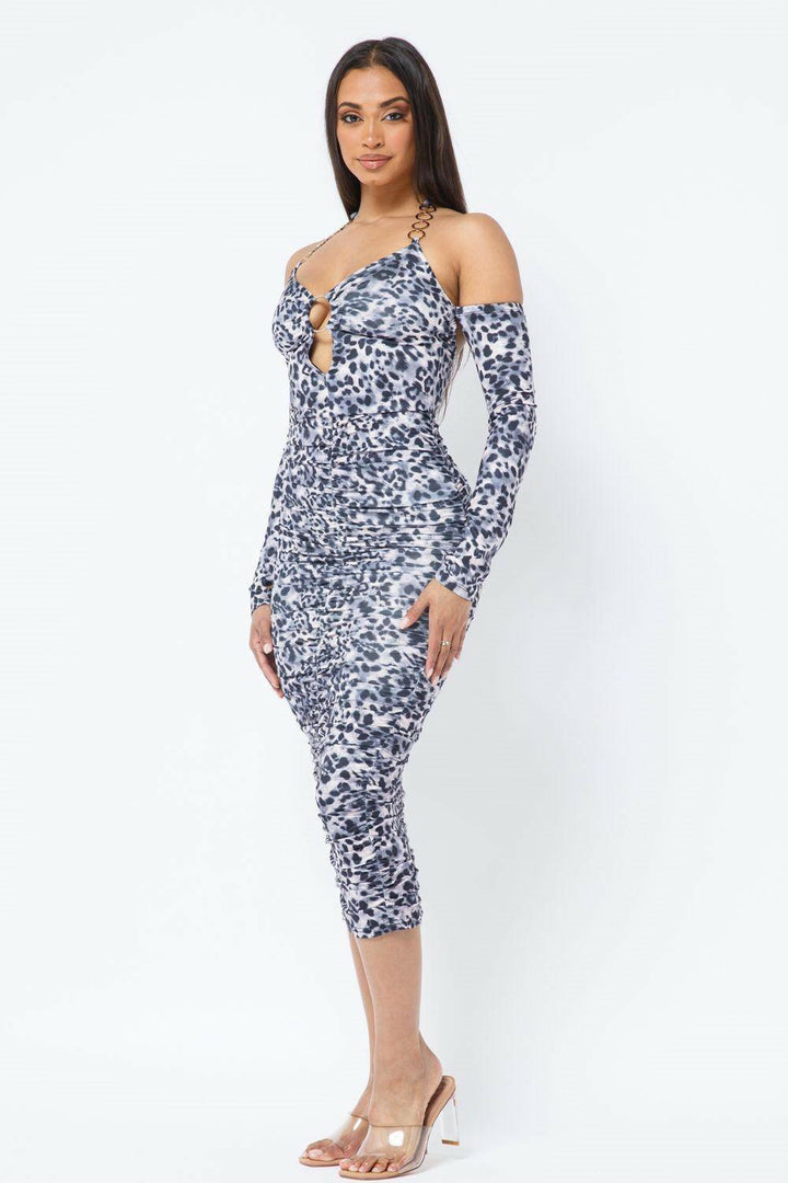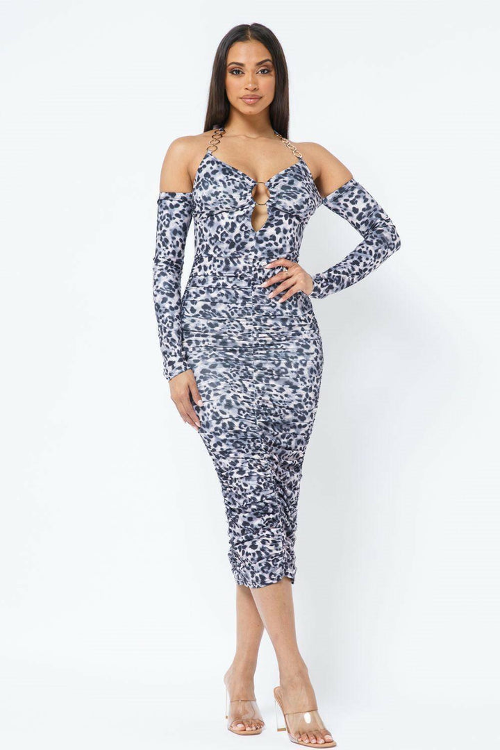 BENITA midi animal print top open shoulder with attached long sleeve Midi dress.