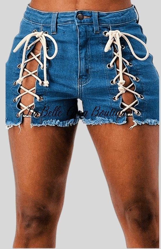 Upgrade Your Wardrobe with Blue Denim Shorts – High Rise, Medium Blue, Front Lace Up