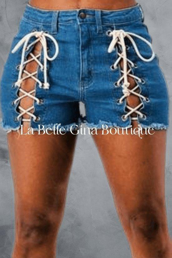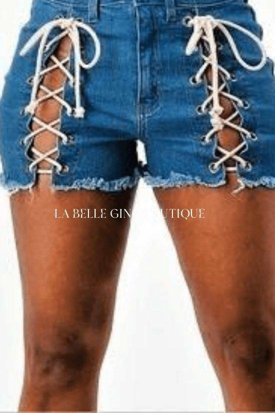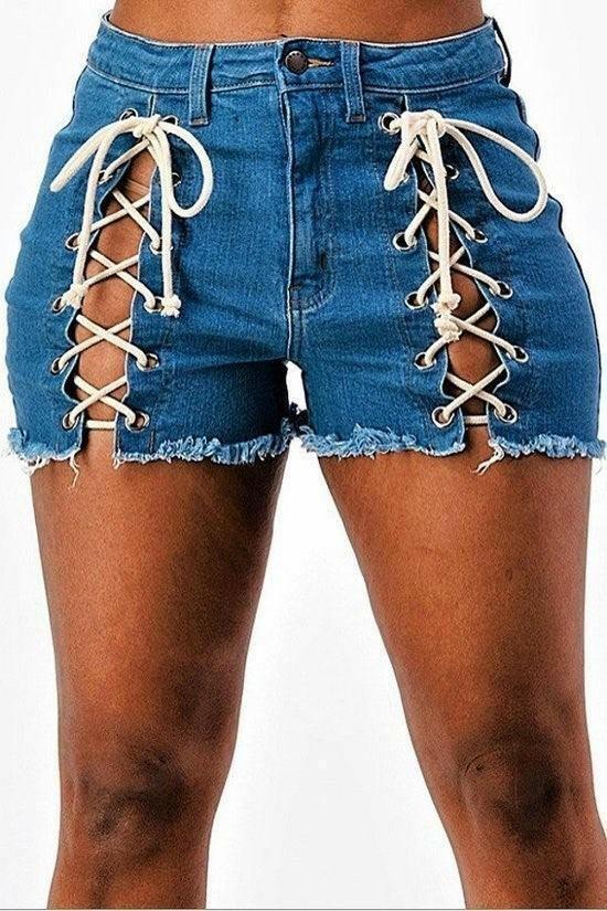 Experience the perfect fusion of contemporary fashion and practicality in these shorts. The standout lace-up design on the front allows you to customize your fit for all-day comfort. This unique feature not only lets your personality shine through but also transforms classic denim into a statement piece. The seamless blend of high-waisted style smooths your silhouette, making these shorts your new staple under everything from tees to tanks and cozy sweaters.