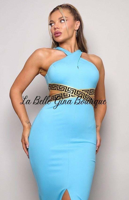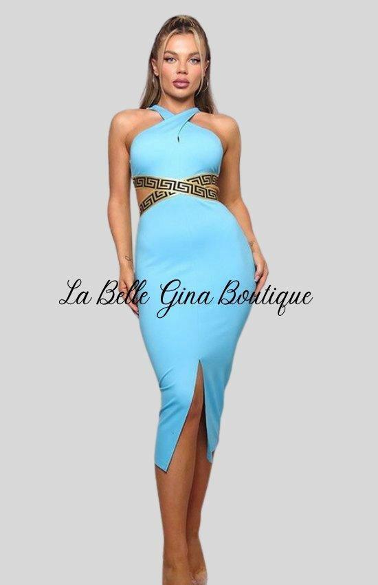 Camille Crossed Front Halter Geo Trim Mini Dress-Aqua - La Belle Gina Boutique