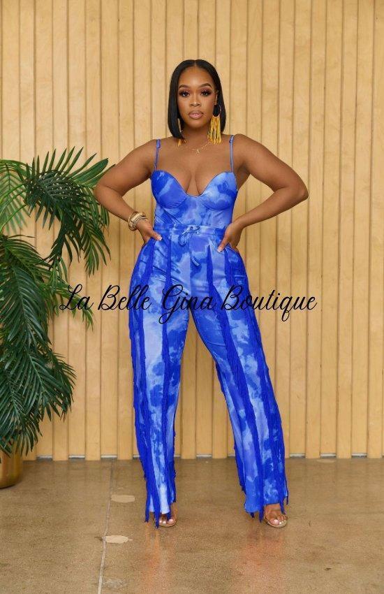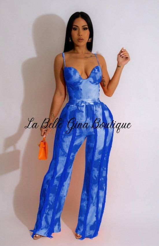 Clara Printed Fringed Lace Camisole Bodysuit And Pants Set-Blue - La Belle Gina Boutique