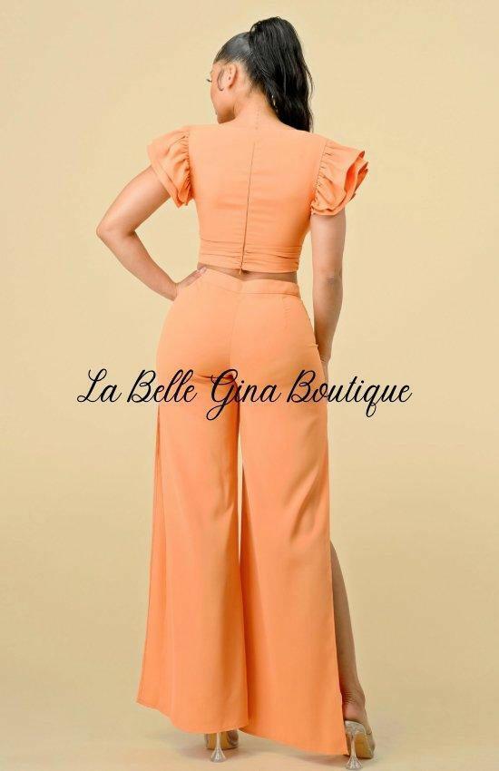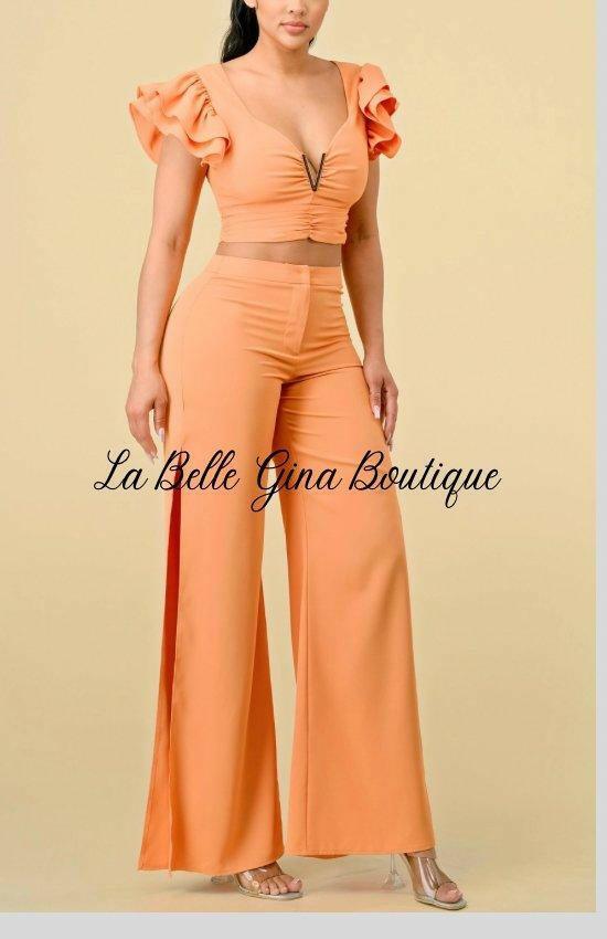 Clara Ruffle Trim Top And Slit Pants Set-Baby Orange - La Belle Gina Boutique