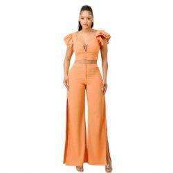 The baby orange Ruffle trim top and slit pants set.This lovely set crafted from lightweight fabric feature beautiful pleating throughout with a slit stylish wide leg pants and hidden side zipper