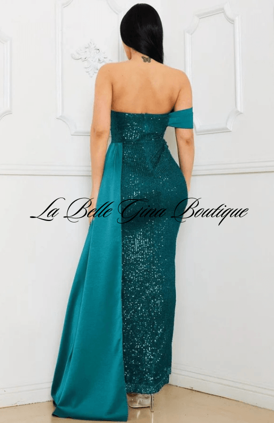 Claudia Satin and Sequin Off Shoulder Maxi dress