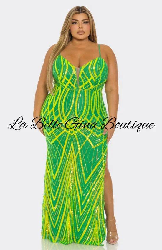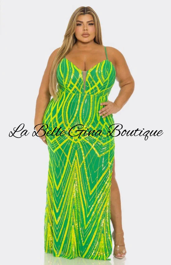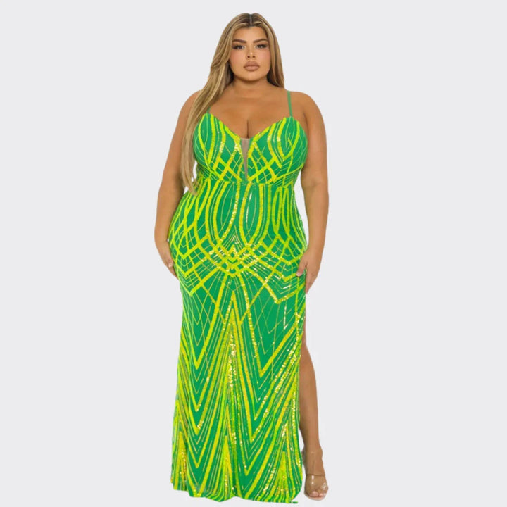 Embracing a plus size evening gown is about celebrating your self-love and signature style. Such a meaningful wardrobe piece supports you through countless cherished events—from romantic dinners to extravagant galas. The neon green and yellow sequins offer an eye-catching twist, giving a lasting modern sheen to a timeless shape. Adjustable straps guarantee a flawless and comfortable fit that feels custom-made, while the high slit balances elegance with a playful touch. Slipping into a dress made with your figure in mind is empowering. Honor your remarkable shape, showing the world that style and comfort know no size.