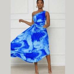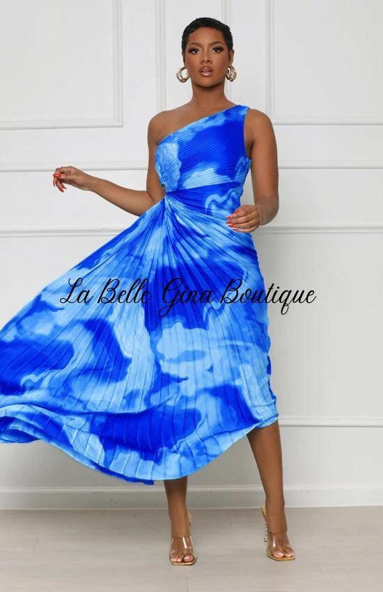 Elise one shoulder wispy print pleated maxi dress-Dark Blue - La Belle Gina Boutique