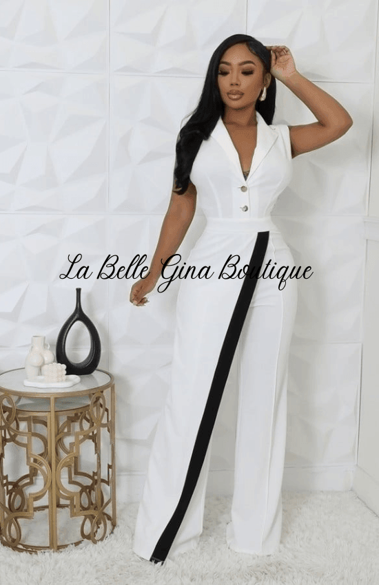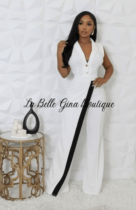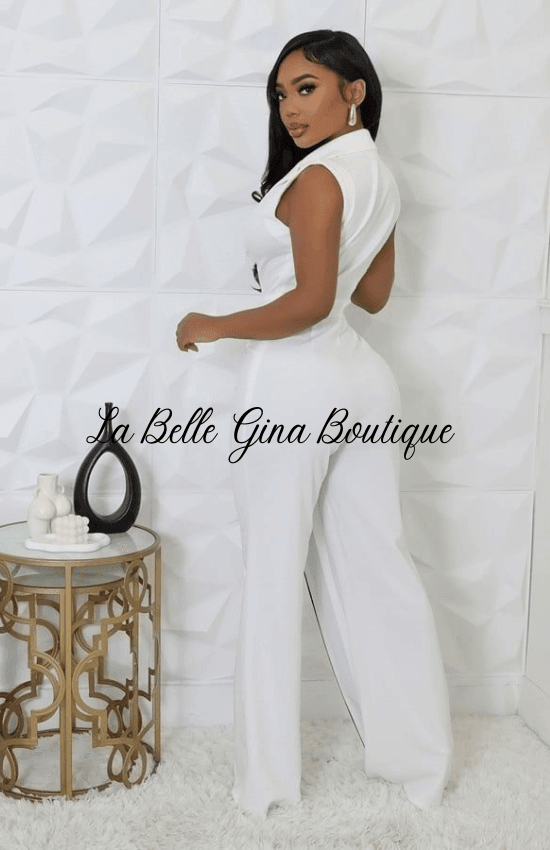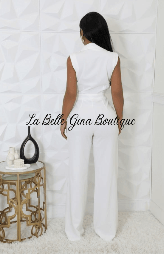 Gina Stretch Collar V-Neck Sleeveless Side Zipper Closure wide Leg Jumpsuit-White