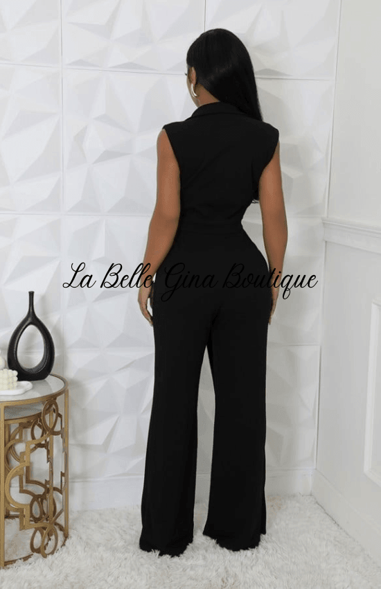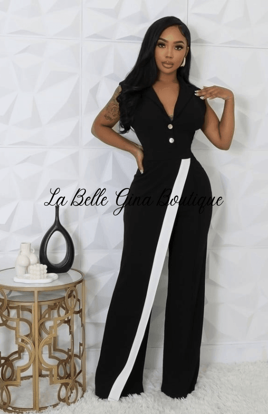 Update your going-out wardrobe with the Gina Stretch Collar Jumpsuit. This sleek sleeveless design boasts a flattering V-neck, side zipper, and wide legs for a chic look. Perfect for making a stylish statement wherever you go.