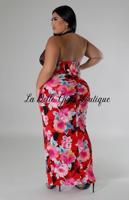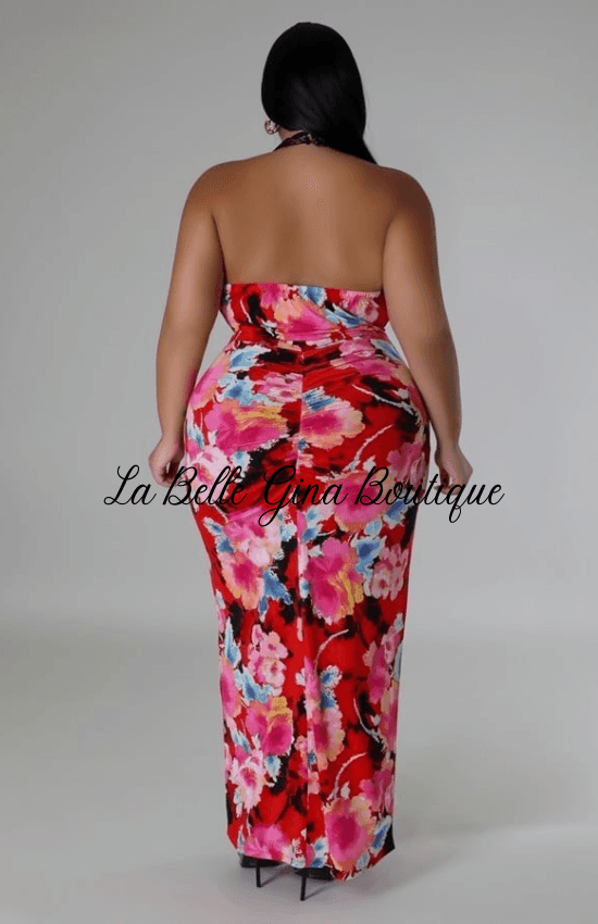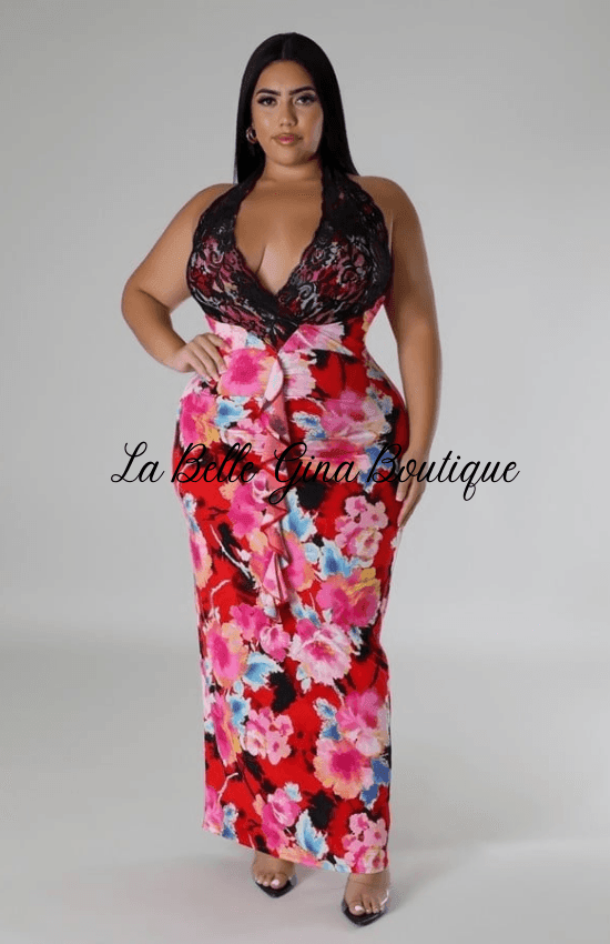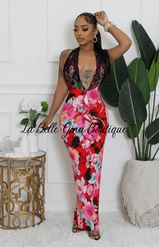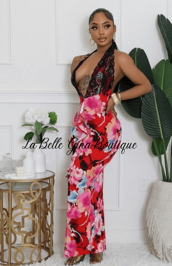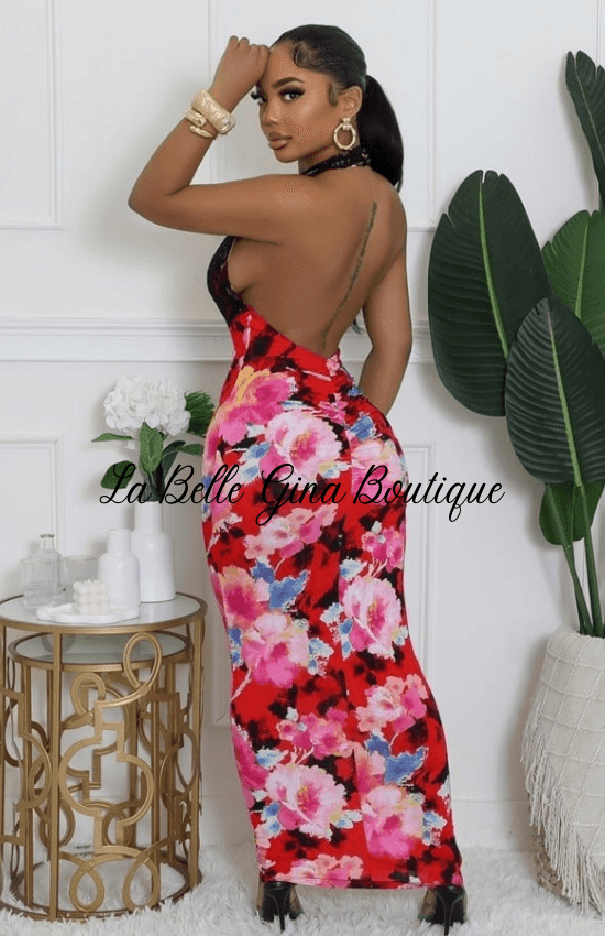 Gina Stretch Halter Neck Sleeveless Lace Details Open Back Maxi Dress