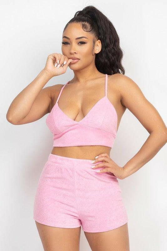 Step up your everyday loungewear with this towel bralette top set, the ultimate choice for a plush and stylish look. The terry towel fabric feels soft and gentle, ideal for women who crave comfort and a cozy, elevated style. Luxurious softness defines this set, ensuring it is perfect for lounging at home or wearing while running errands.