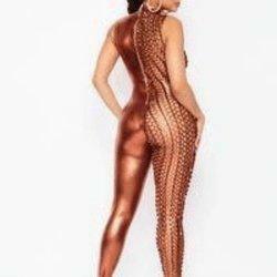 This fashionable jumpsuit features a sophisticated mock neck that elevates its modern style. Its sleek lines and tailored silhouette flatter your figure while allowing for comfortable movement. The thoughtful construction adds to your confidence, whether you're at an elegant party or a casual gathering with friends. The smooth, glossy material gently hugs your frame, adding a touch of elegance with every step.