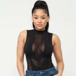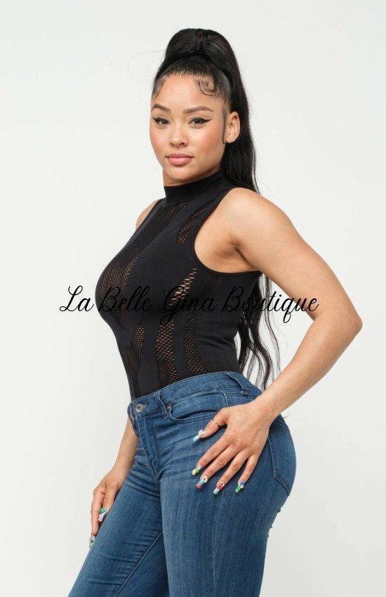 Seamless Sleeveless All Over Fishnet Detail Mock Neck Bodysuit