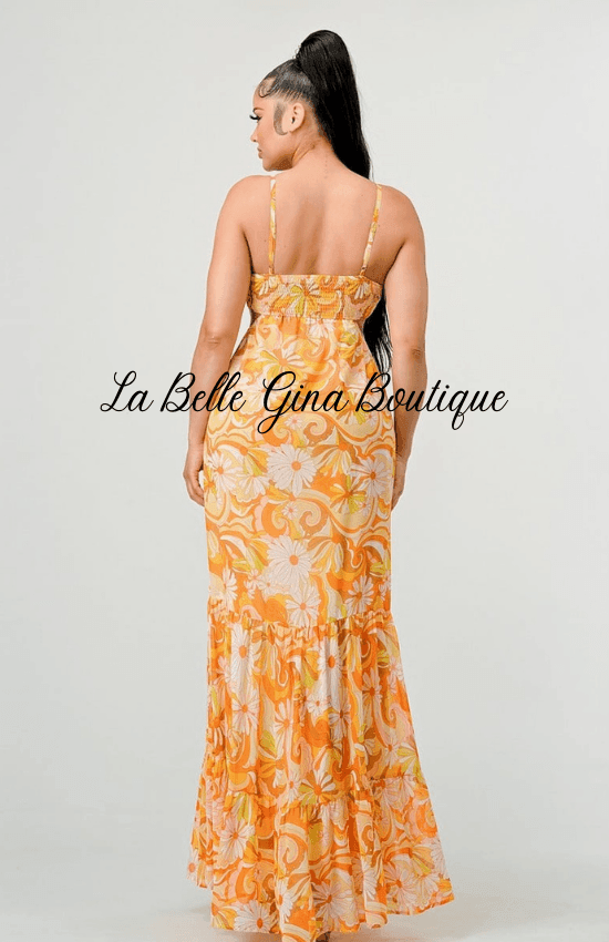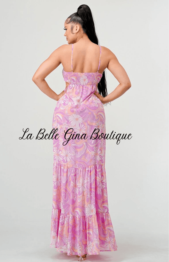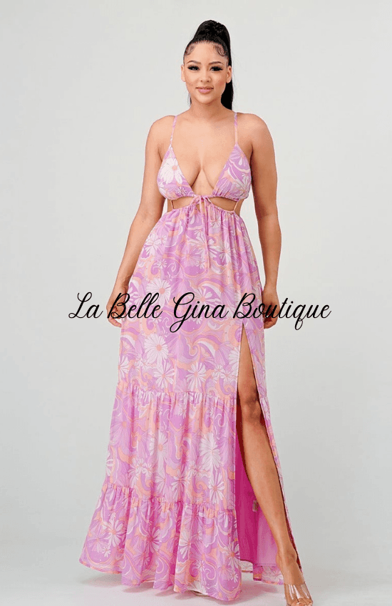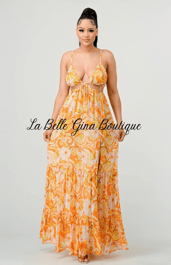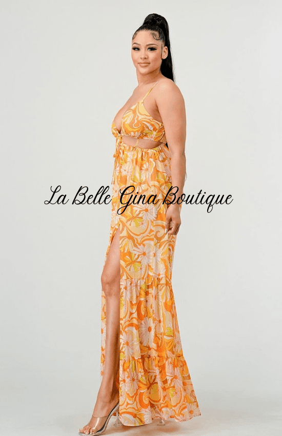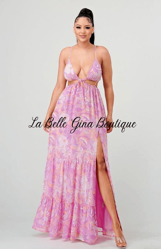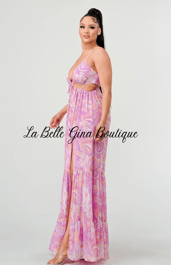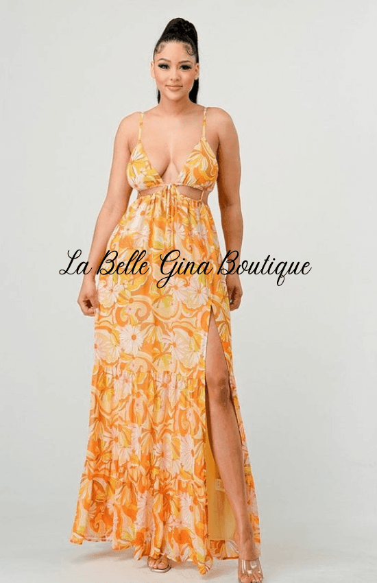 Feel like a goddess in the June Floral Chiffon Maxi Dress. With a flattering drawstring front tie and a daring bra slitted design, this dress is perfect for making a statement at any event.