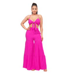 Introducing our June Open Front Tie Top and Wide Flare Pants Set in stunning Fuchsia! This captivating set is perfect for any occasion, whether you're looking for a casual ensemble, a chic cocktail outfit for an evening party, or a stylish choice for a romantic date night.