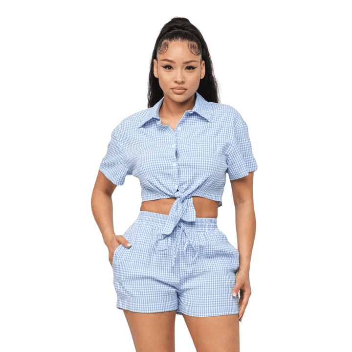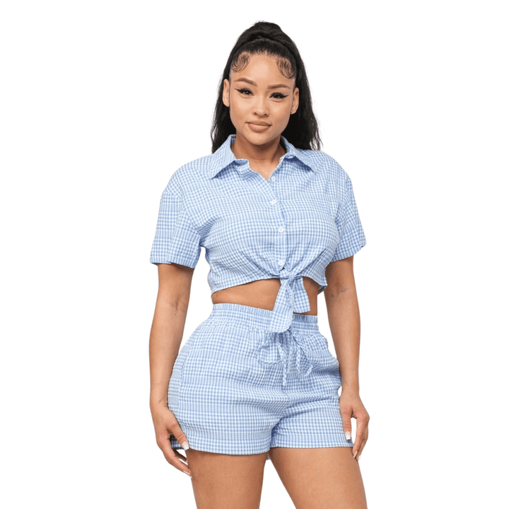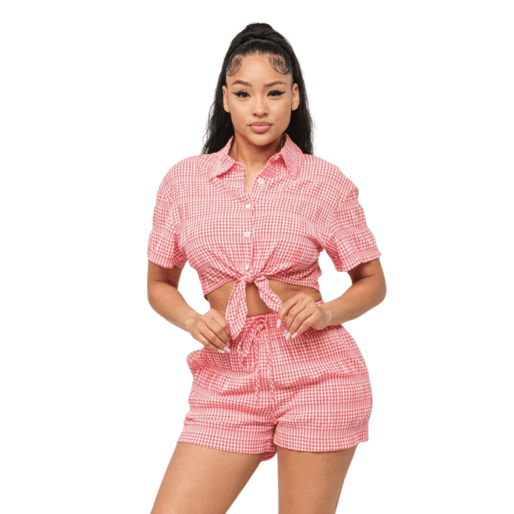 June Seersucker Fabric Gingham Print Front Functional Button-Down Shorts Set.