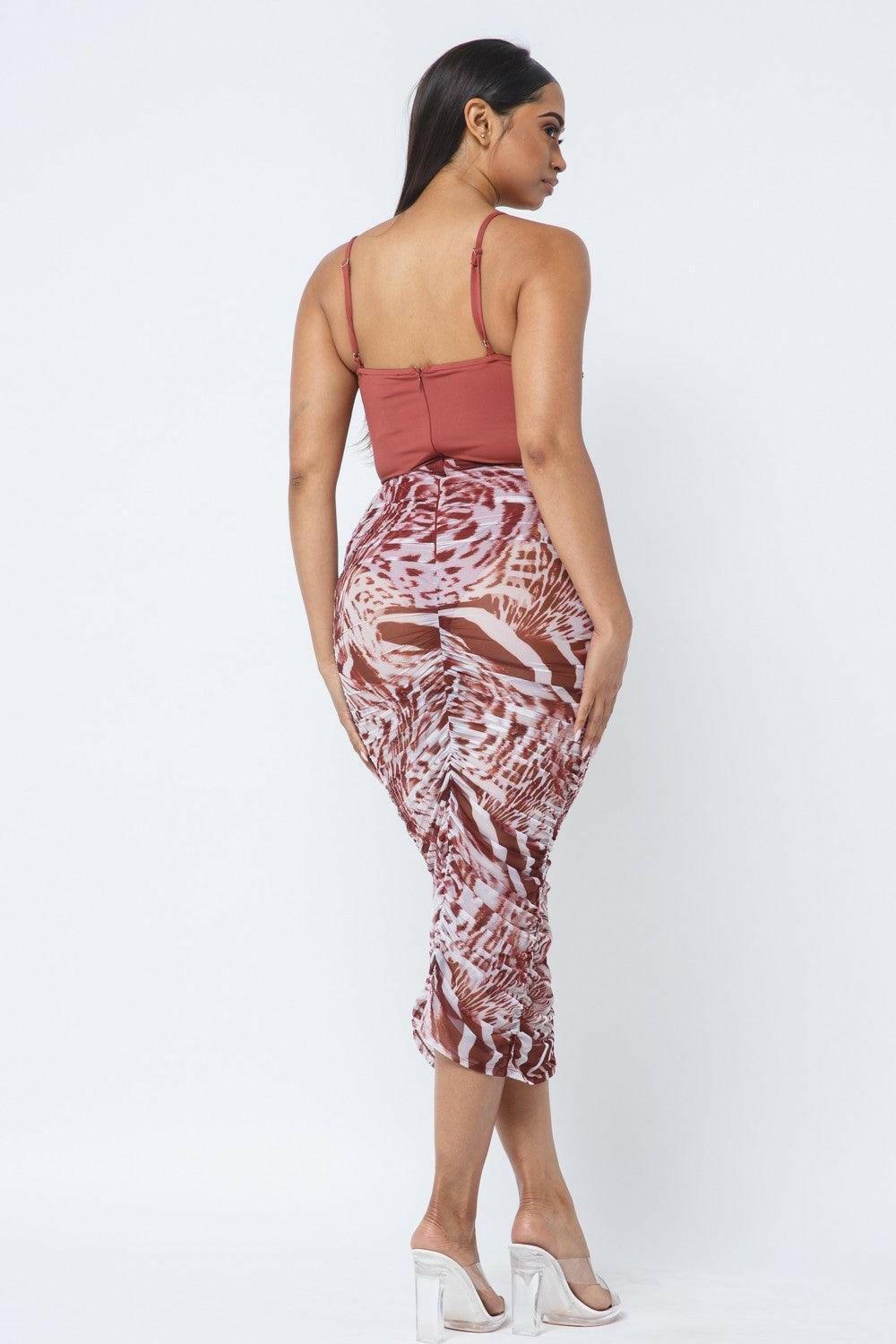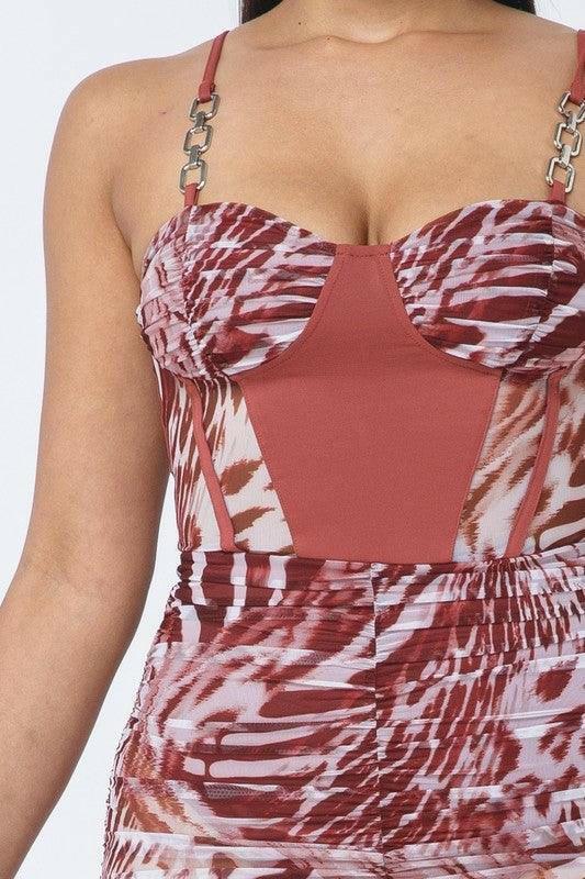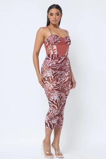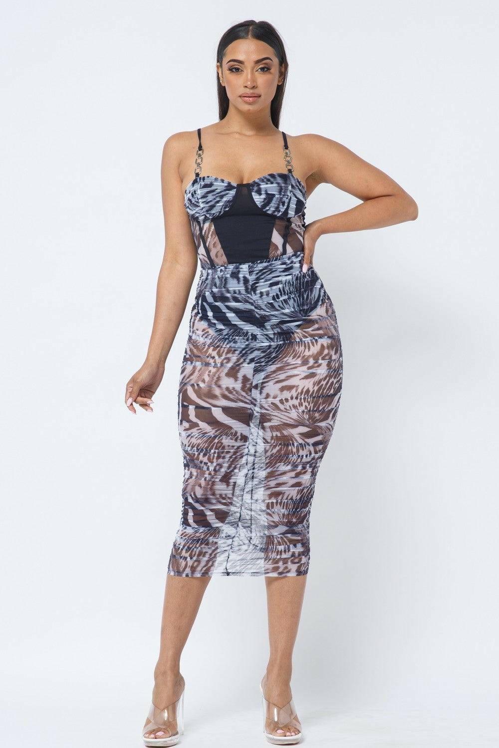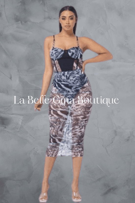 Spaghetti strap mesh see through midi dress with attached bodysuit,back zipper.