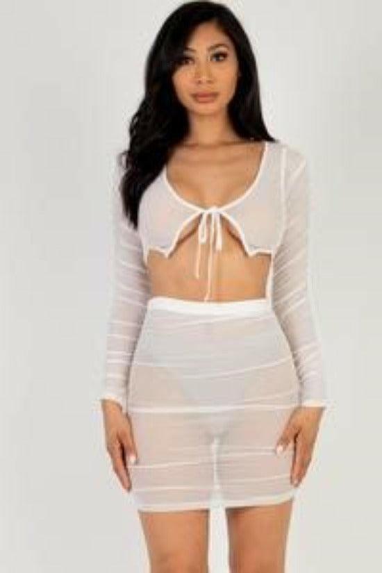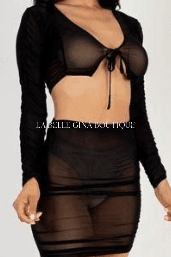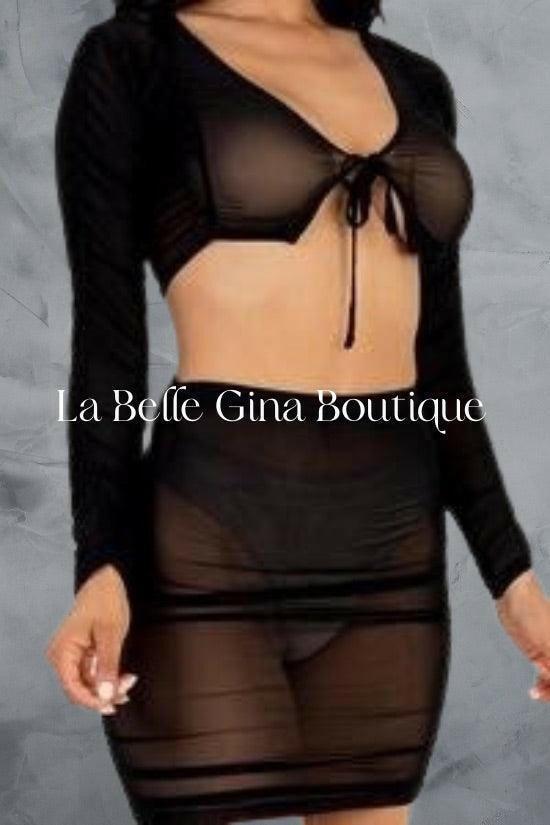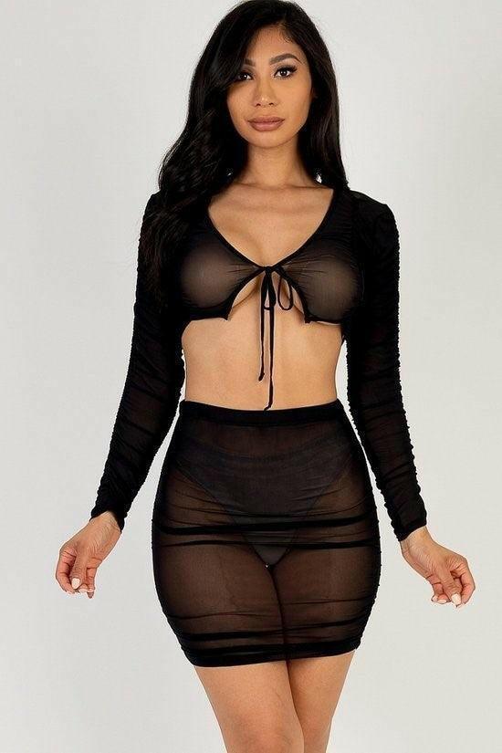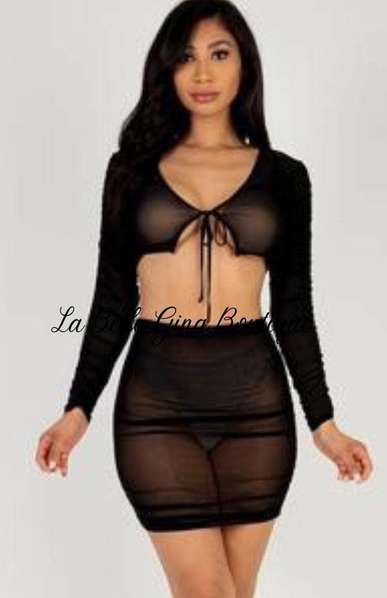 Kay sheer mesh tie front crop top and rushed side mini sets. - La Belle Gina Boutique