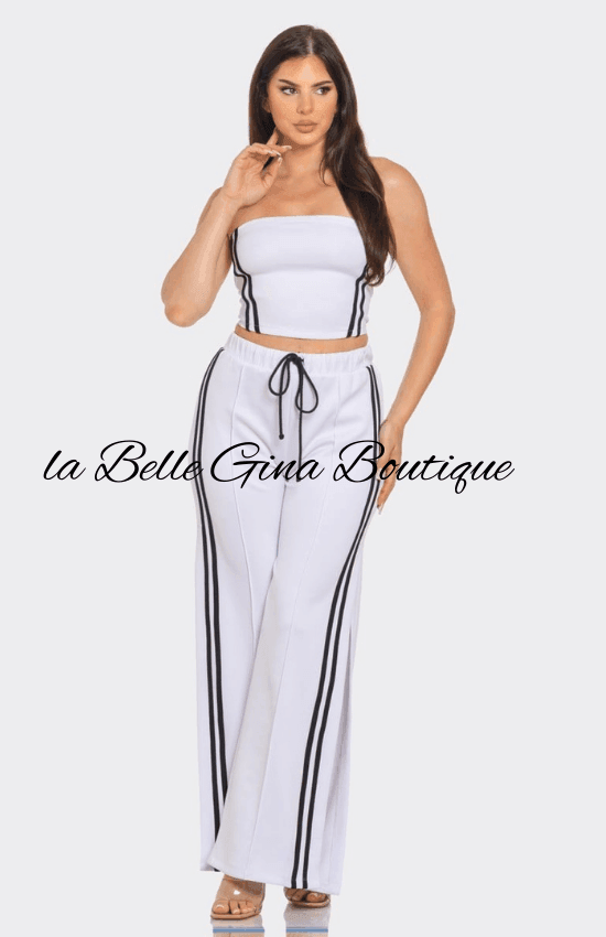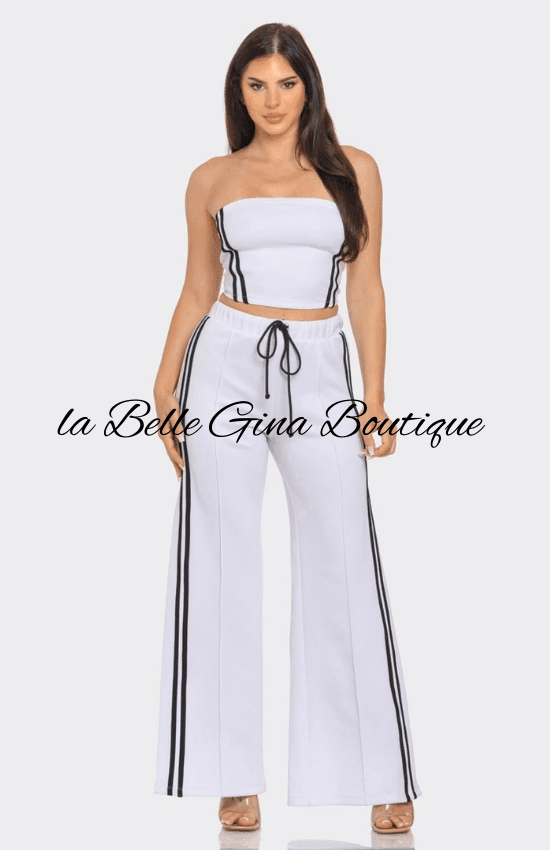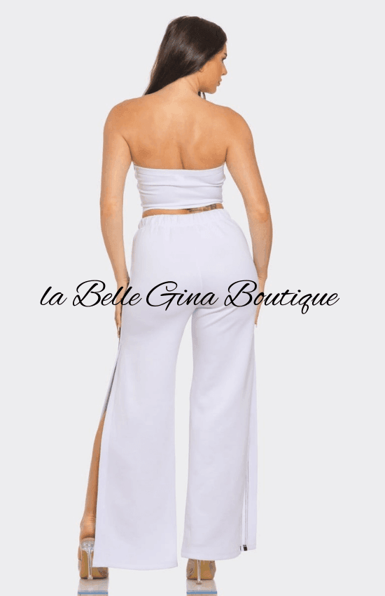 Laila Sleeveless Solid Side Two Stripe Detail Tube Crop Top and Side Slit Flare Pants Set-White