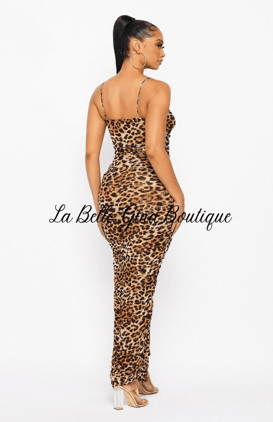 Unleash your wild side with the Lala Leopard Printed Maxi Dress. This sleeveless stunner features an all-over rushed design and a high slit on one side, perfect for those who love daring style. Stand out from the crowd in this semi-sheer showstopper.