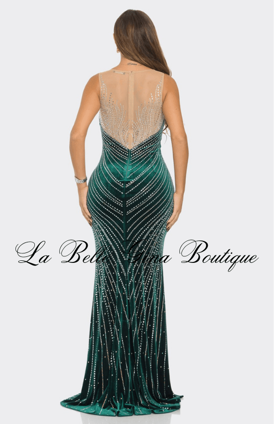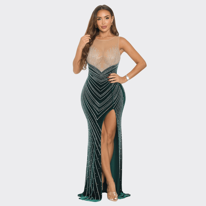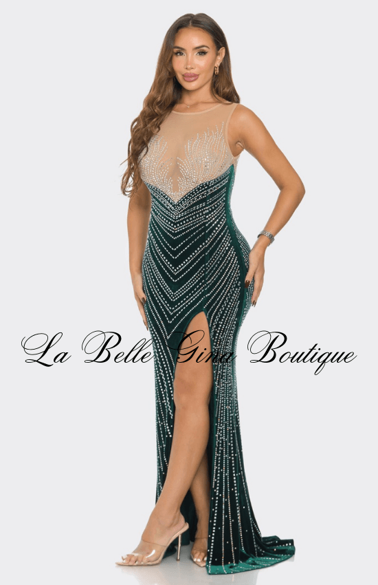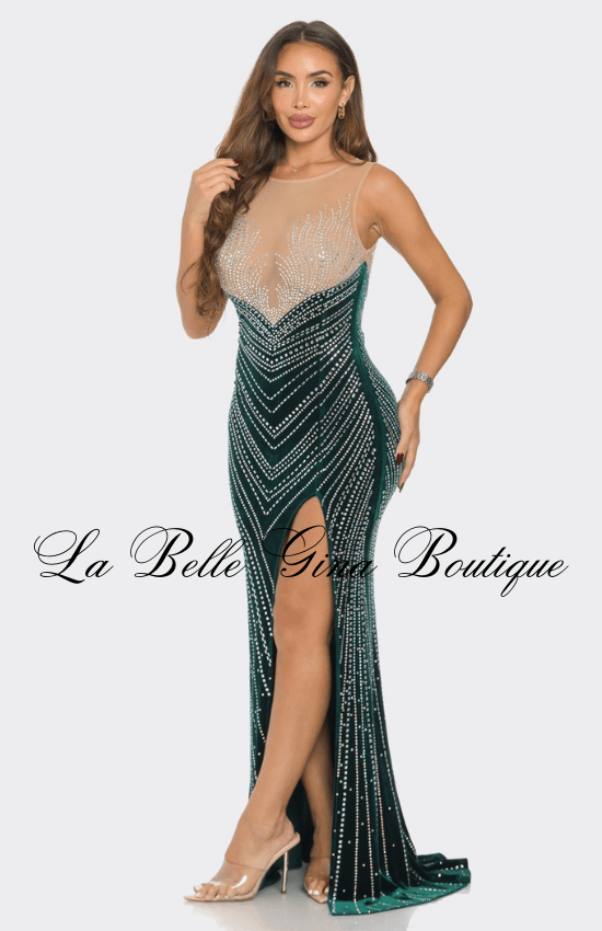 This remarkable creation transforms the idea of modern sophistication. It is designed with attention to detail, aiming to flatter your figure and lift your confidence. The opulent velvet fabric and dazzling rhinestone accents have been hand-picked to craft a one-of-a-kind silhouette. With these exquisite materials and the unique design, your ensemble feels exclusive and exudes elegance from every angle.