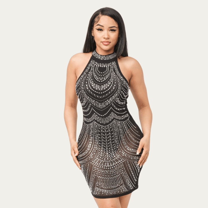 Pair the Mini Rhinestone Dress with elegant heels to elongate the legs further. Choose minimal jewelry since the rhinestone detail already acts as an accessory. A sleek clutch and bold lipstick can complete a chic evening look. The dress’s versatility means you can also layer a fitted jacket or shawl to suit cooler weather or more formal atmospheres.