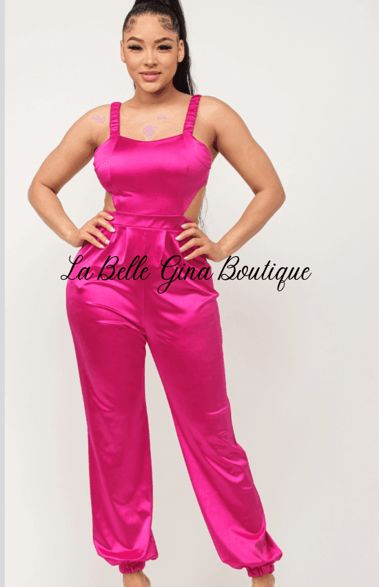 Turn heads in our Satin Cutout Jumpsuit, designed to flatter your shape while giving you that luxurious satin glow. With wide straps, side cutout details, and a chic cinched ankle design, this jumpsuit brings elegance and edge together in one unforgettable piece.