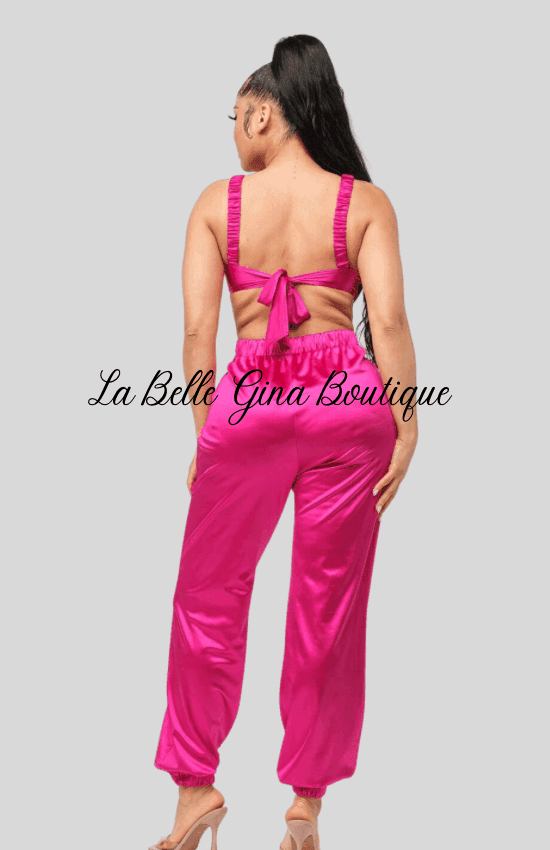 Laura Open Bow Tie Elastic Shirring Detail Jumpsuit-Fuchsia - La Belle Gina Boutique