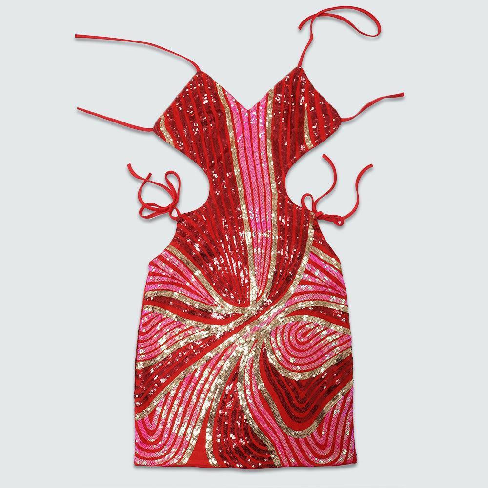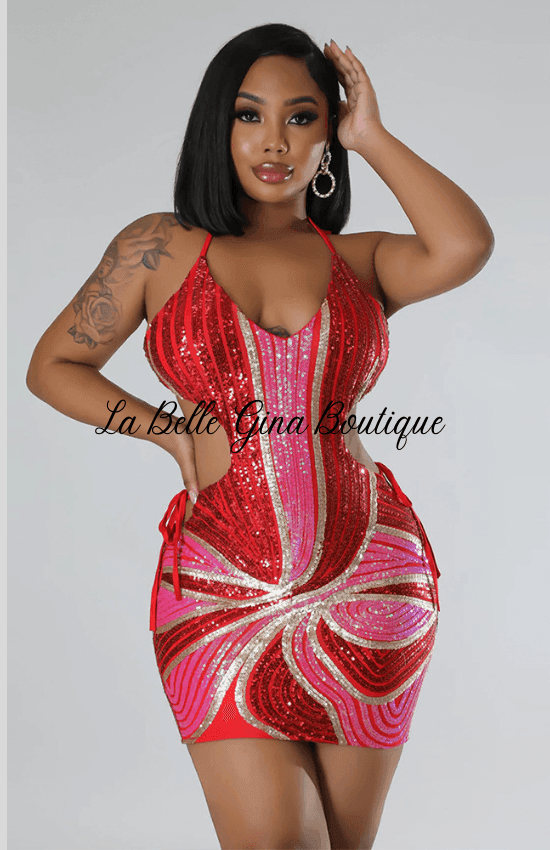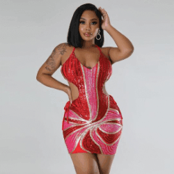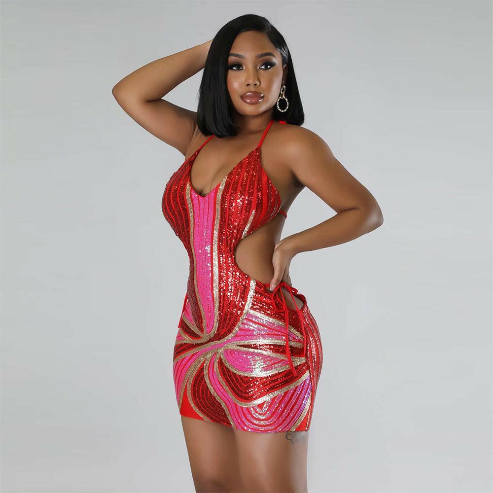 • https://www.labelleginaboutique.com/collections/womens-midi-dressesHip wrap.short skirt,neck hanging Sequin dress-Red