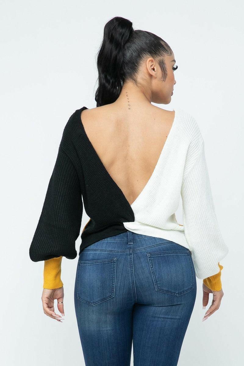 Upgrade your wardrobe with our Color Block Twisted Open Back Cozy Sweater and experience the perfect blend of comfort and fashion. Don't miss out on this must-have piece that will keep you cozy and stylish all season long.