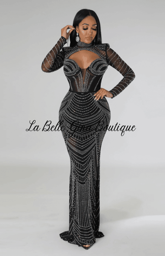 This dress is tailored for those who crave a perfect balance of drama and elegance. The full-length design sweeps gracefully along the floor, while strategically placed cutouts contribute to a fresh, modern aesthetic. The see-through mesh adds intrigue while remaining refined. If you are searching for a show-stopping statement piece, this elegant garment brings both sophistication and boldness to any ensemble.